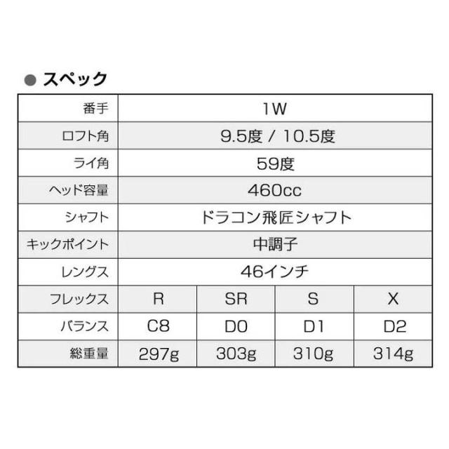 | シャフト | ドラコン飛匠(三菱ケミカル) 飛距離最優先シャフト。2種類のカーボンによるハイブリッド化がオートマチックにヘッドを加速させ、インパクトの衝撃によるヘッドの不要な挙動を抑え、最適な打ち出し角とスピン量になるようにヘッドをインパクトへ導く。 |