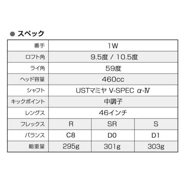 | シャフト | V-Spec α-4(USTマミヤ) クセのないマイルドなセッティングとワングレード上の高強度、高弾性カーボンシートの採用により、幅広いゴルファーに適応。 コストパフォーマンスをも兼備した高性能シャフト。 |