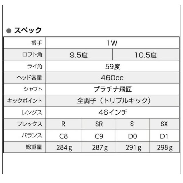 | シャフト | プラチナ飛匠(三菱ケミカル) 軽さと強度に優れた新軽量カーボンをフルレングス全面に使用。当たり負けしない大幅ヘッドスピードアップを実現。先端鋼性を強化したセッティングにより、最速の走り感と抜群の球のつかまりやすさが体感可能。 |