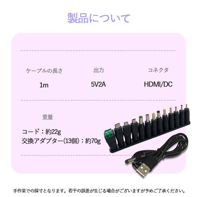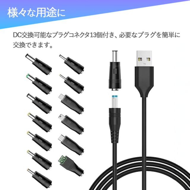 【商品説明】あったら助かるUSB-DC 変換ケーブル変換プラグは13種付き!古い機材にはDCプラグが必須不可欠、 どれかは適合するので何かと便利!dcプラグ usb変換アダプタはカメラ、タブレット、携帯電話、パワーバンク、自宅の電話システムVoIP電話ルーター、Serato DJコントローラー、MP3Nextbook /ウェブカメラルーター、おもちゃ、レコーダーBluetoothスピーカー、スキャナー、DVR 、ハードディスクボックスなどなどほとんどの種類の家庭用電子機器に適しています。また、micro-USB、Mini-USB、Type-C、LED Converter Plug もついているのでさらに幅広くお使いできます。