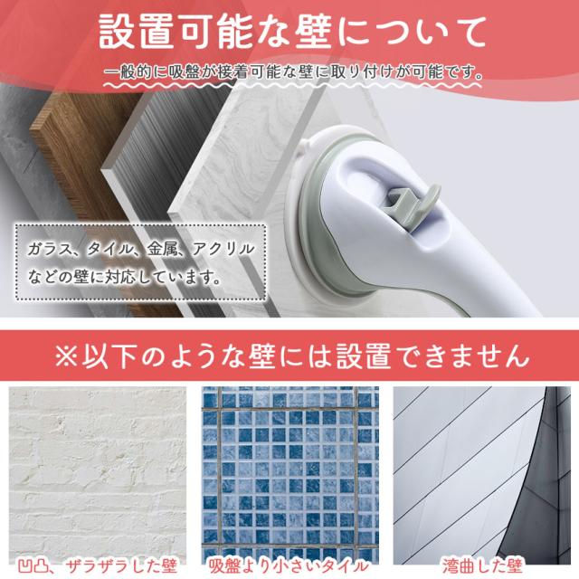 凹凸がありザラザラとした壁や、吸盤の直径より小さいタイル、カーブしている壁などは取り付け不可ですのでご確認ください。