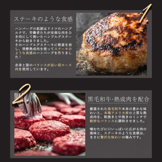 凝縮された黒毛和牛本来の旨みと本場アメリカ産の熟成肉を、粗挽きと中挽きのミンチでバランスよく配合しました。