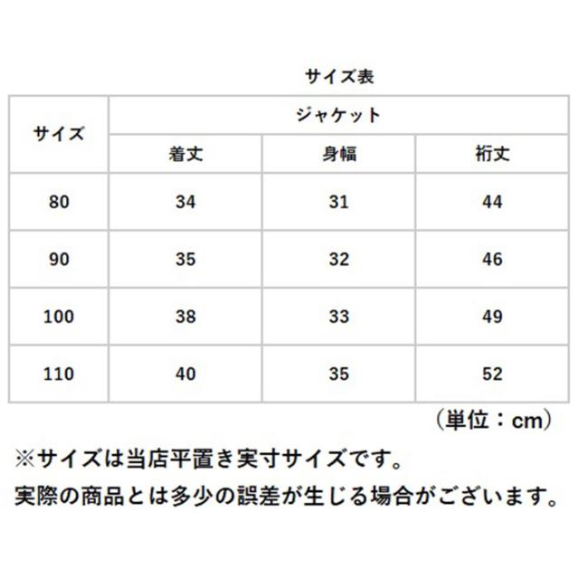 | サイズ | [キッズ] ・80cm ・90cm ・100cm ・110cm ※サイズについて詳細は、商品画像の中にあるサイズ表をご覧くださいませ。 |
