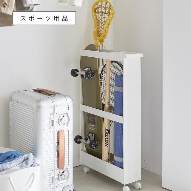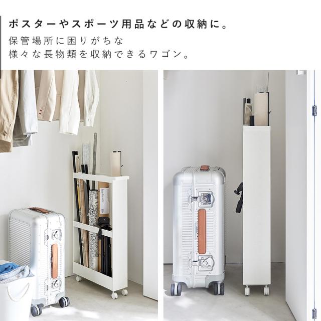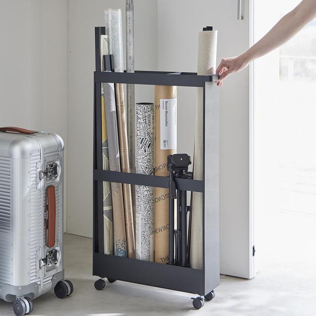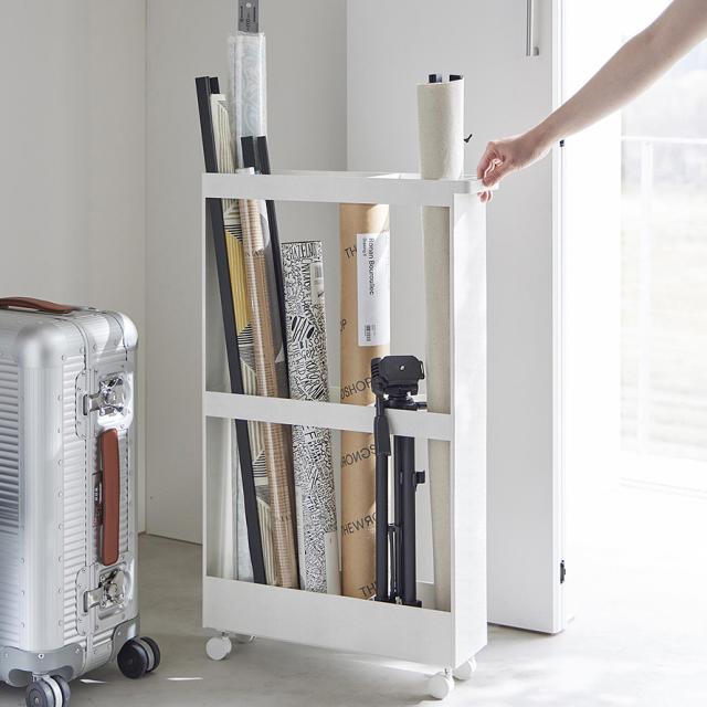 保管場所に困りがちな長物類を一括収納できるハンドル付きのスリムワゴン。