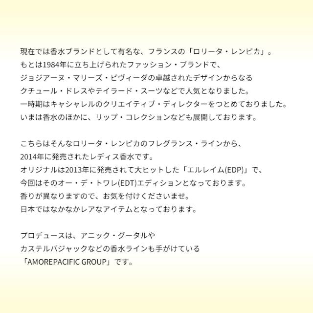 こちらはそんなロリータ・レンピカのフレグランス・ラインから、2014年に発売されたレディス香水です。オリジナルは2013年に発売されて大ヒットした「エルレイム(EDP)」で、今回はそのオー・デ・トワレ(EDT)エディションとなっております。香りが異なりますので、お気を付けくださいませ。日本ではなかなかレアなアイテムとなっております。