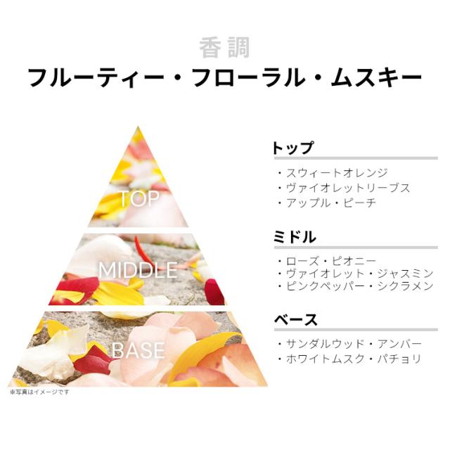 スウィート・オレンジ、ヴァイオレット・リーブス、アップル、ピーチなどが、ラブリーなフルーティー・ノートを香り立たせるトップから、