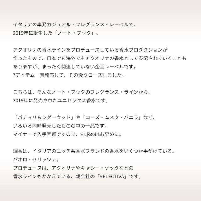 こちらは、そんなノート・ブックのフレグランス・ラインから、2019年に発売されたユニセックス香水です。