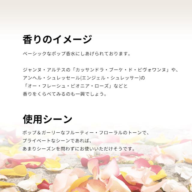 ポップ&ガーリーなフルーティー・フローラルのトーンで、プライヴェートなシーンであれば、あまりシーズンを問わずにお使いいただけそうです。オー・ド・トワレ(EDT)のなかでも、とてもライトなところも特徴です。