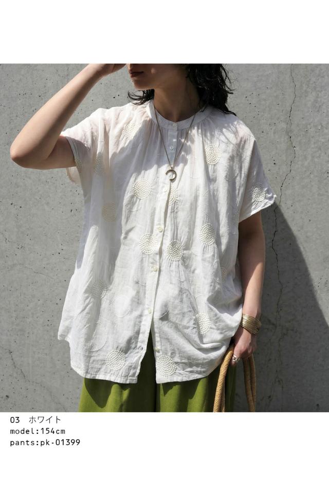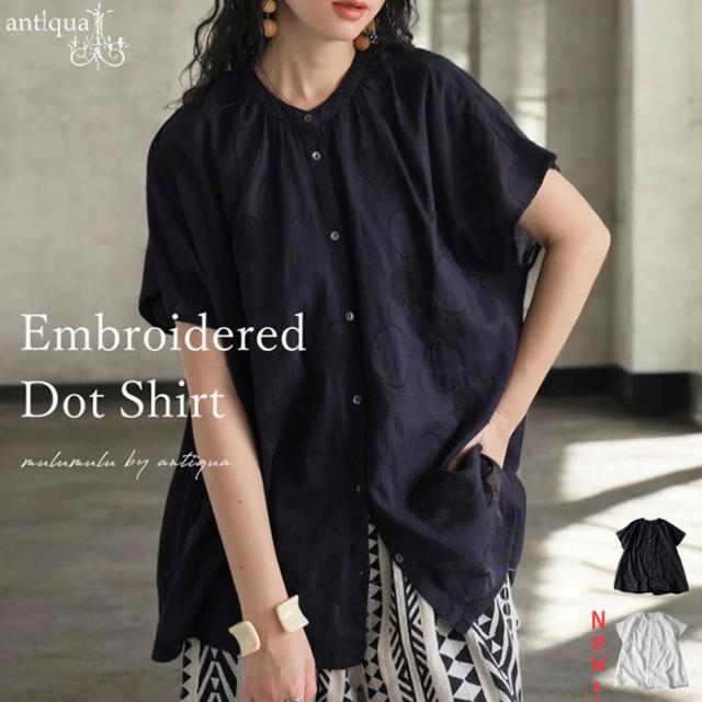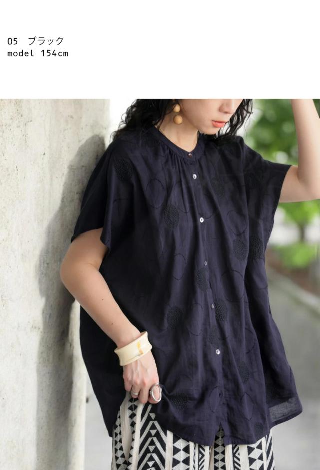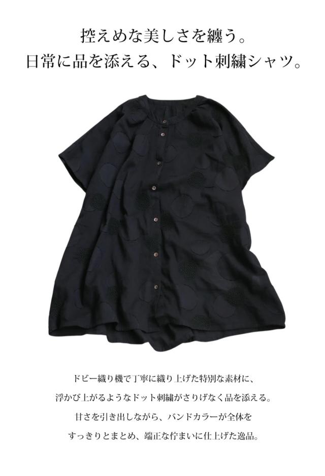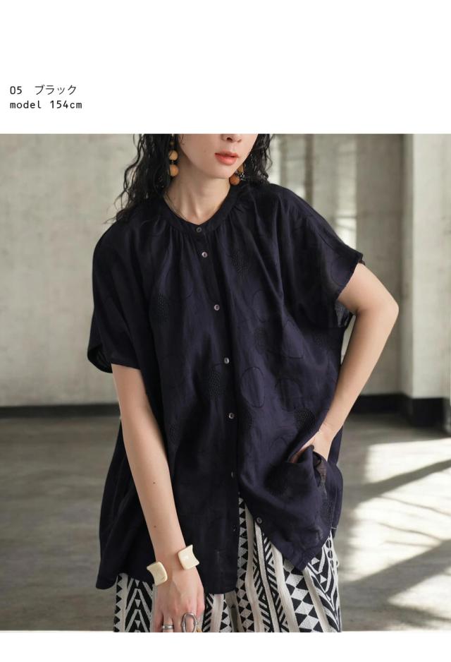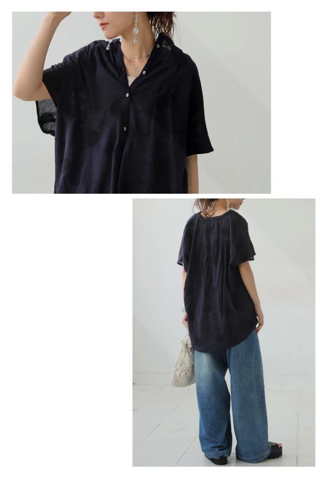 iya-00062 トップス ブラウス ドット柄 刺繍 バンドカラー フレンチスリーブ ゆったり 体型カバー 前開き ドビー織り 上品 きれいめ カジュアル ナチュラル 軽やか ルーズ シルエット