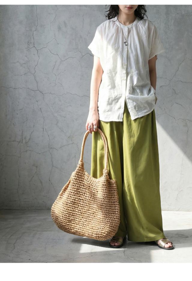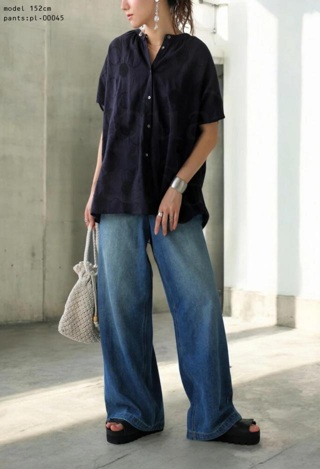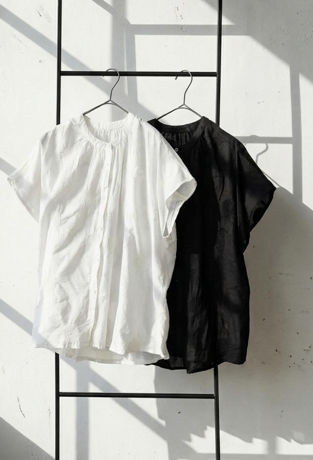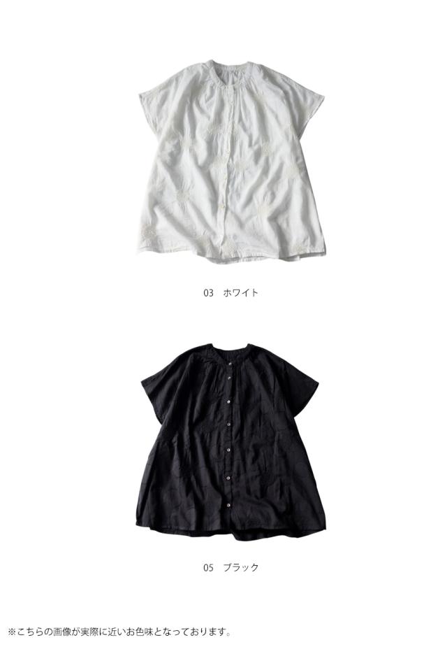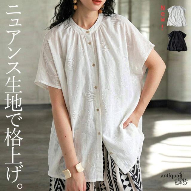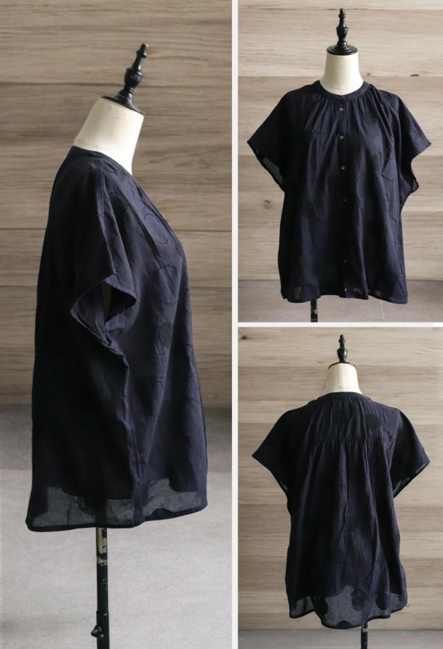iya-00062 トップス ブラウス ドット柄 刺繍 バンドカラー フレンチスリーブ ゆったり 体型カバー 前開き ドビー織り 上品 きれいめ カジュアル ナチュラル 軽やか ルーズ シルエット