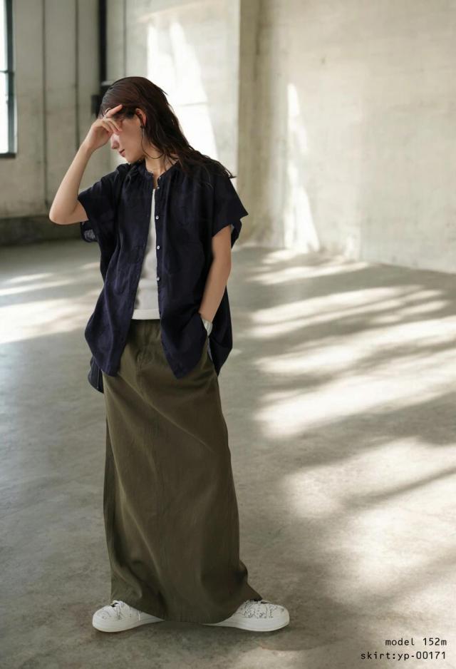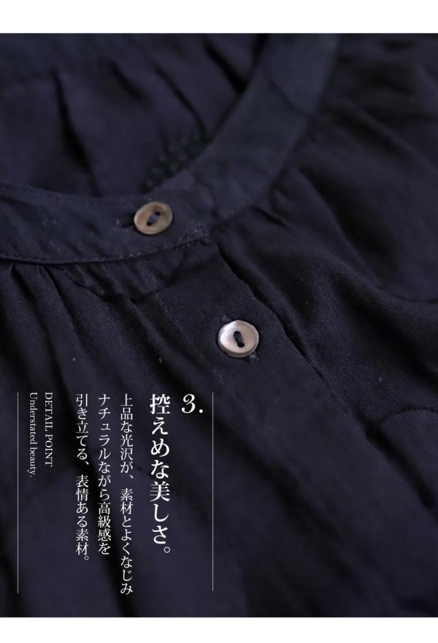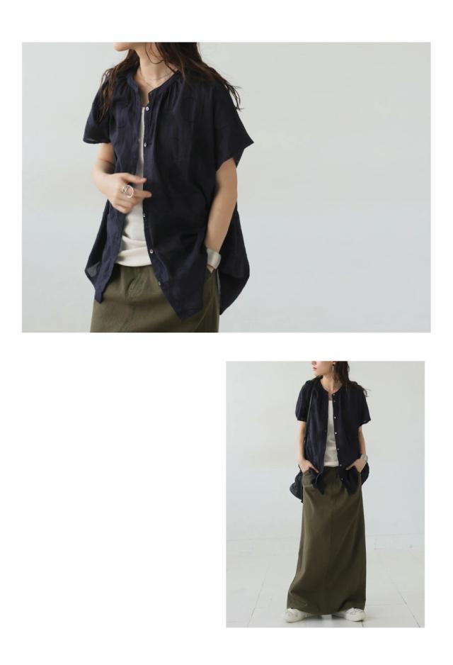 顔まわりをすっきり見せるバンドカラーのネックラインと、肩まわりを自然に包むフレンチスリーブの袖丈で抜け感のある印象に。