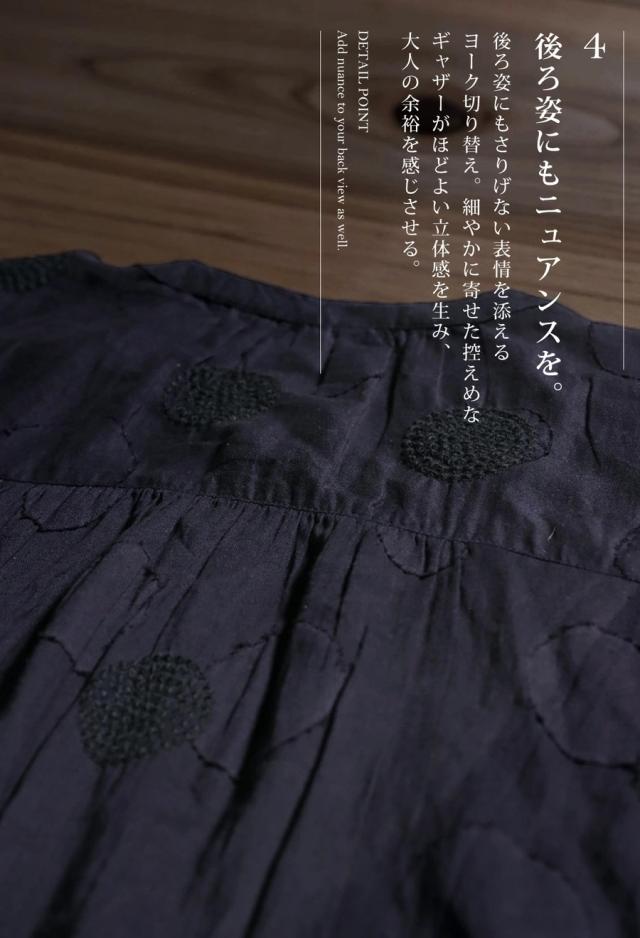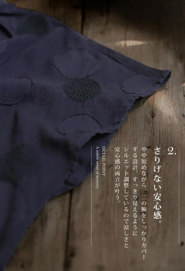 ドビー織りの表情豊かなドット(水玉)柄と、身体のラインを拾いにくいゆったりした形状、腰まわりをさりげなくカバーする丈感が魅力です。