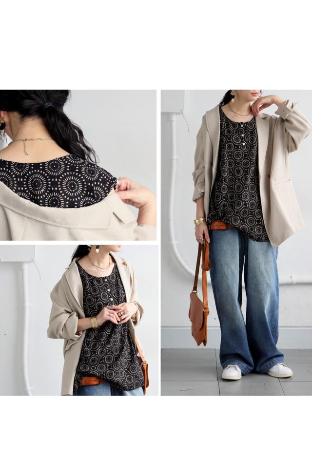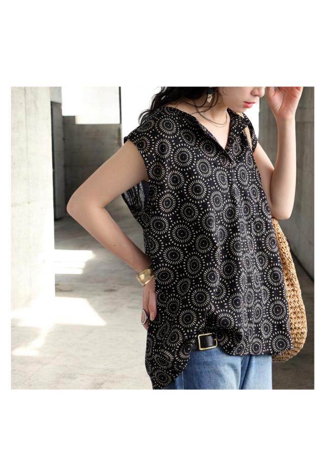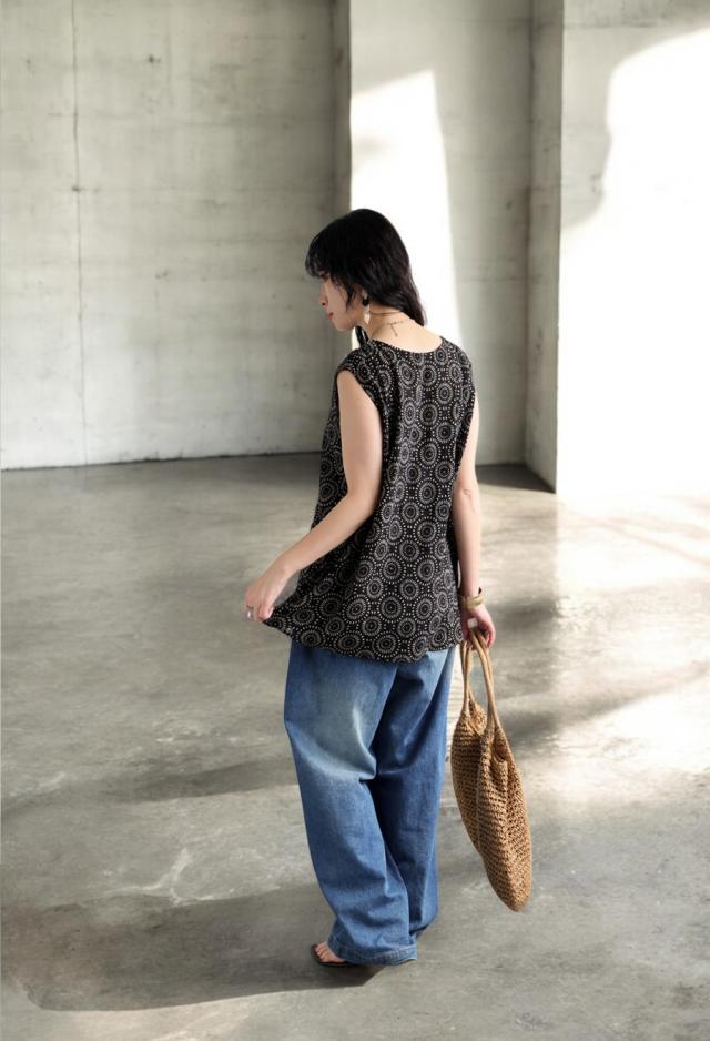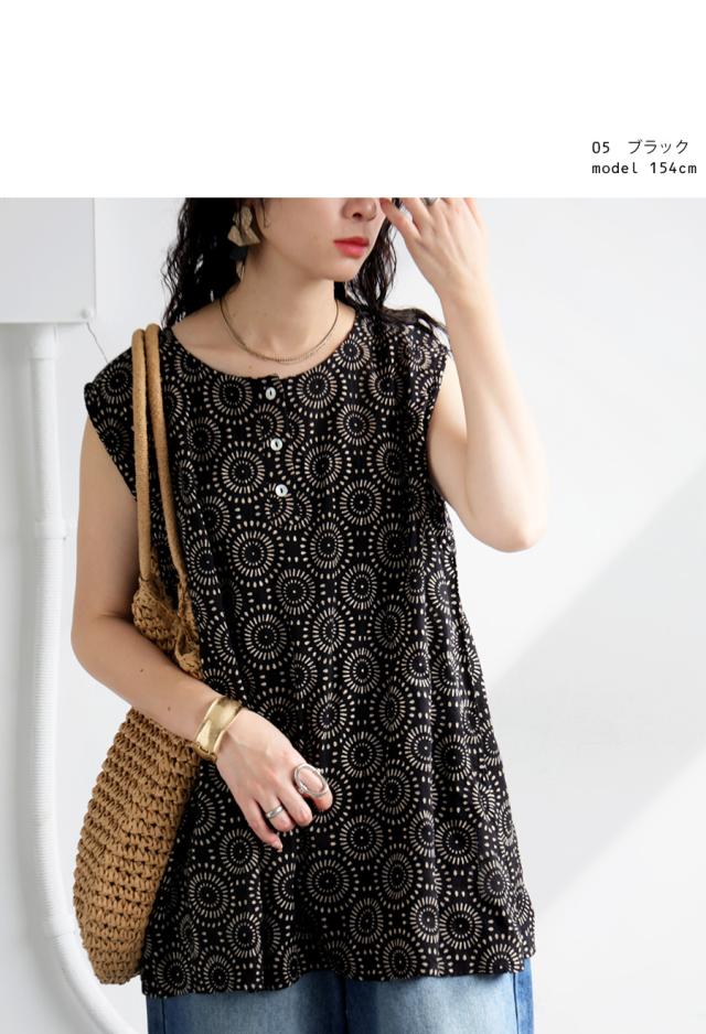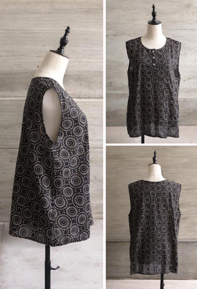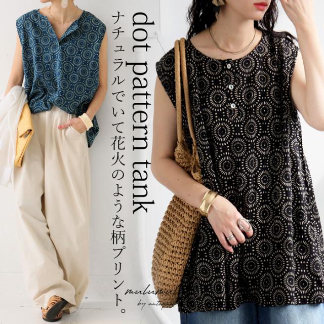 iya-00064 ノースリーブ タンクトップ 丸首 クルーネック ドット柄 柄 花火風 風合い 凹凸 プルオーバー かぶり Aライン シェルボタン ゆったり 上品 高級感 きれいめ モード