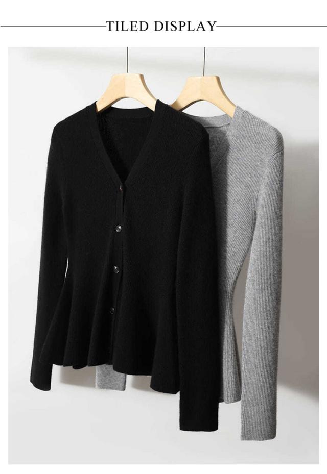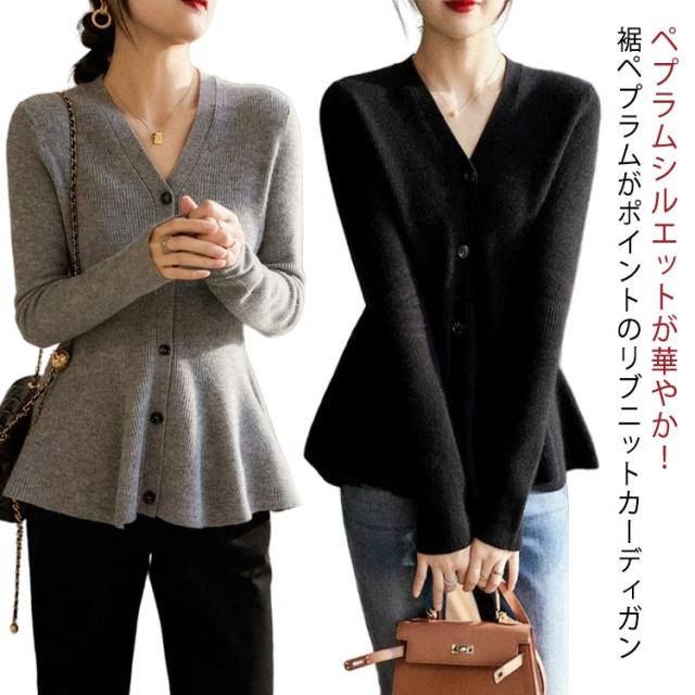 ニット ペプラム カーディガン ペプラムカーディガン カーデ チュニック 長袖 ペプラムニット ペプラムトップス 美シルエット 前開き 羽織 フレア フィット 暖かい ペプラム Aライン フェミニン 華奢見え 送料無料 ブラック