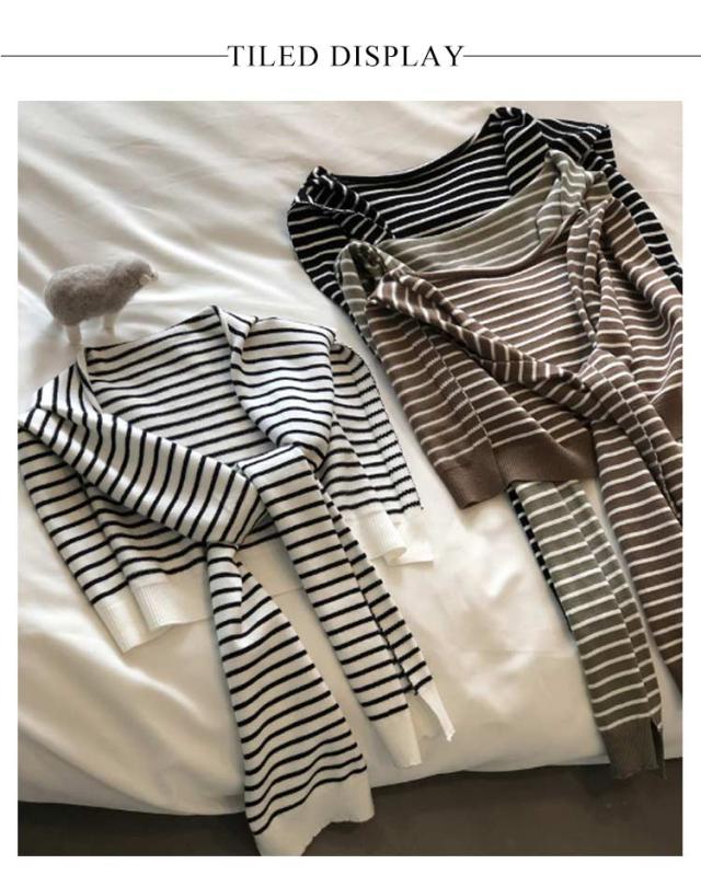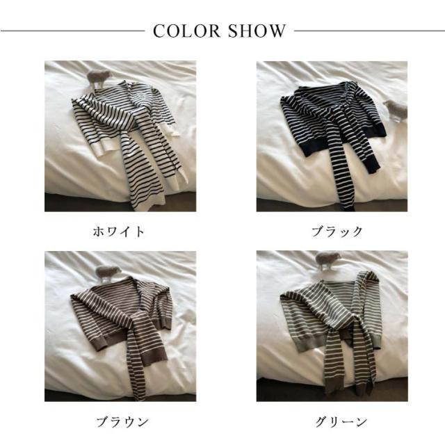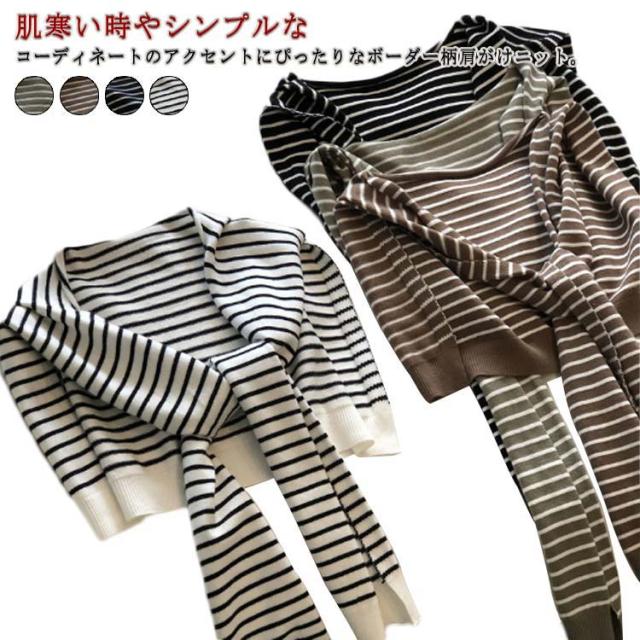 | 肌寒い時やシンプルなコーディネートのアクセントにぴったりなボーダー柄肩がけニット。 付け襟的な感覚で装着するニットショールは、カーディガンよりもかさ張る事もなくスタイリッシュおしゃれに着こなせます。 気になる肩幅やニの腕もカバー、見た目もお洒落で、トップスにボリュームが出て着?せ効果。 薄手で持ちやすく使わない時には折りたたんでバッグにIN。 肩冷え対策として、春 夏 秋 冬 のシーズン活躍してくれます。 | |