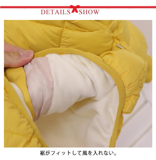 | キッズ 中綿ジャケット 裾がフィットして風を入れない。 手を突っ込んだら、暖かくゆったり手の入りやすいポケット。 袖リブ仕様で少しゆとりがある丸めのシルエットも可愛らしい、ダウンアウターの着膨れを感じなり自然な仕上がり。 | |