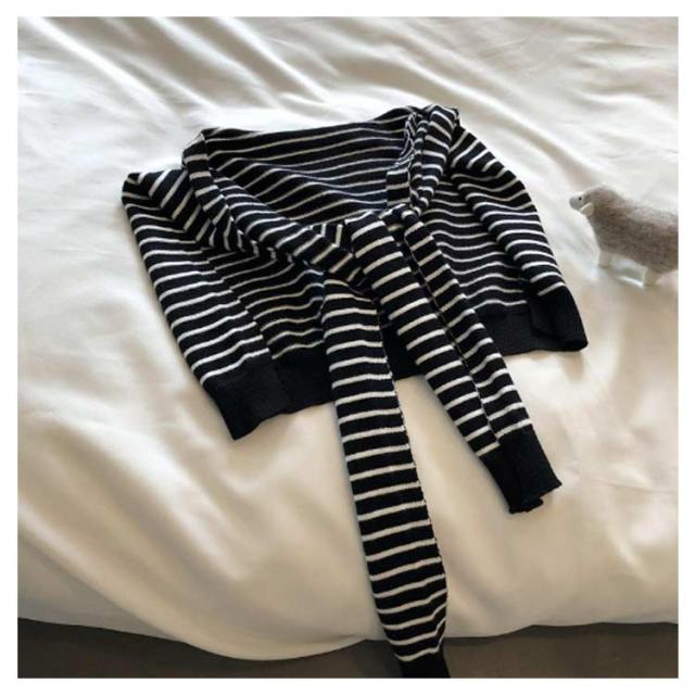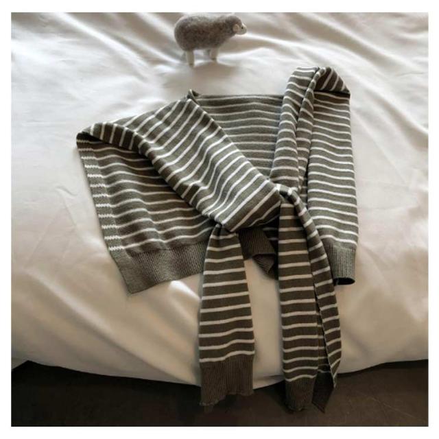 | 肌寒い時やシンプルなコーディネートのアクセントにぴったりなボーダー柄肩がけニット。 付け襟的な感覚で装着するニットショールは、カーディガンよりもかさ張る事もなくスタイリッシュおしゃれに着こなせます。 気になる肩幅やニの腕もカバー、見た目もお洒落で、トップスにボリュームが出て着?せ効果。 薄手で持ちやすく使わない時には折りたたんでバッグにIN。 肩冷え対策として、春 夏 秋 冬 のシーズン活躍してくれます。 | |