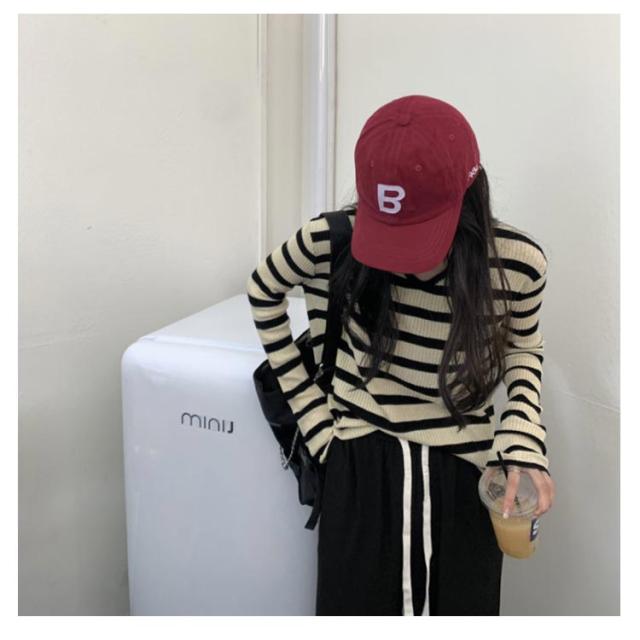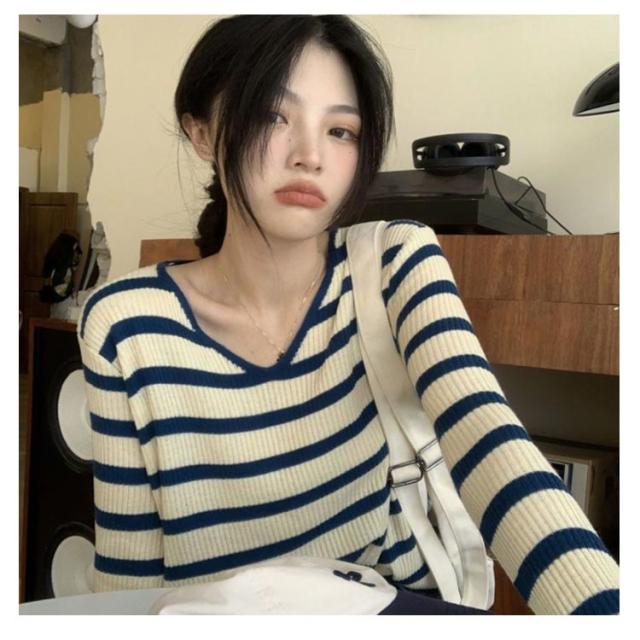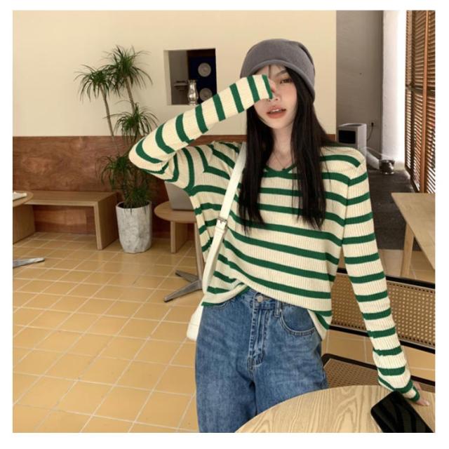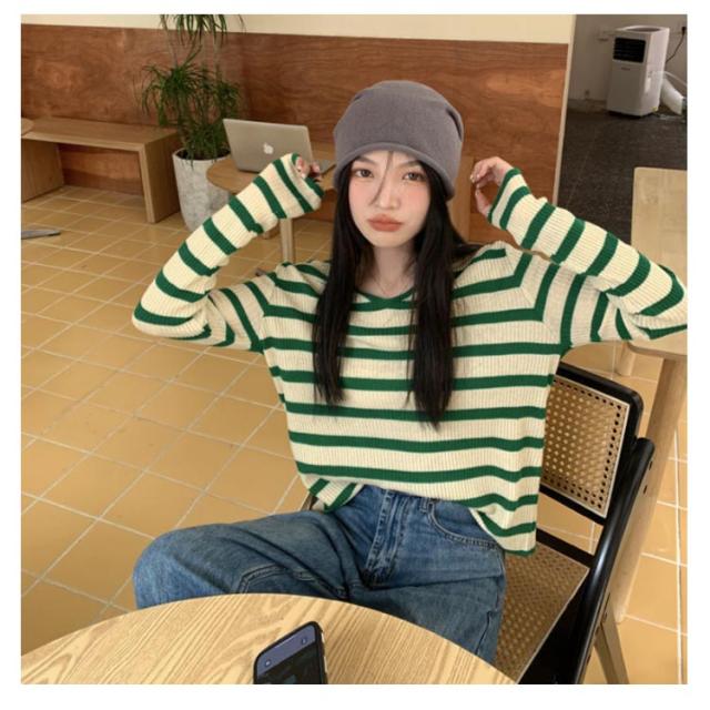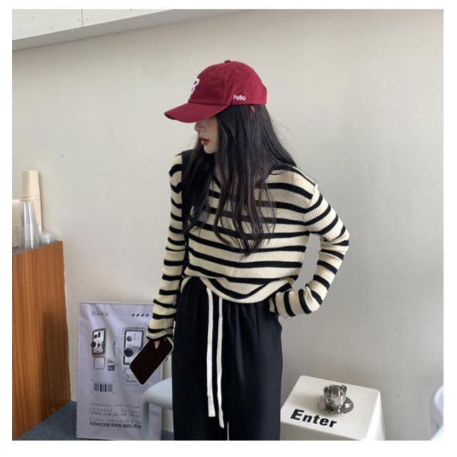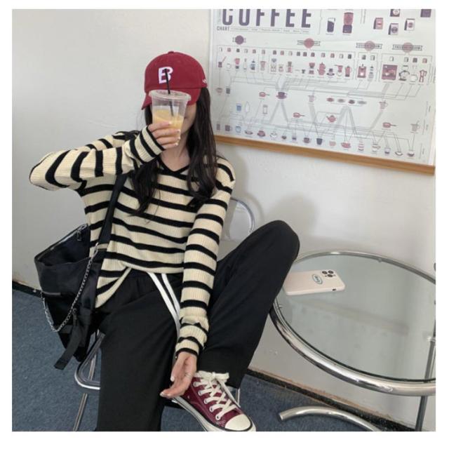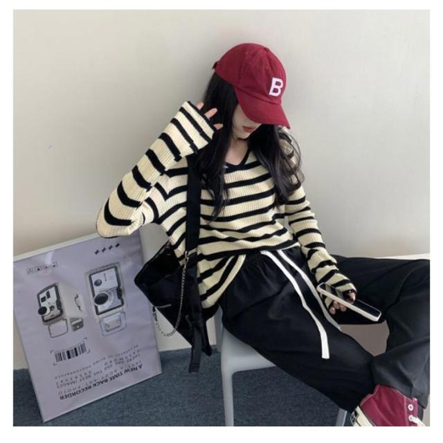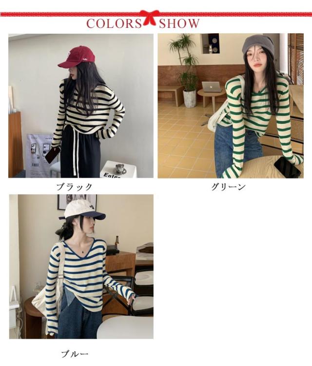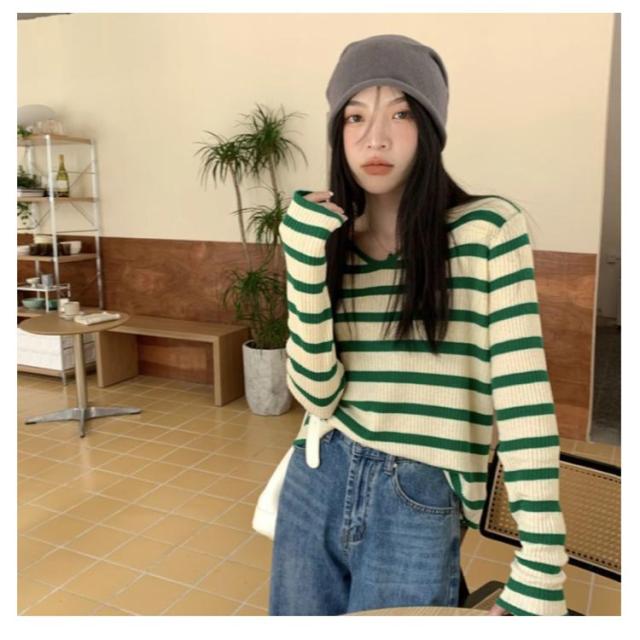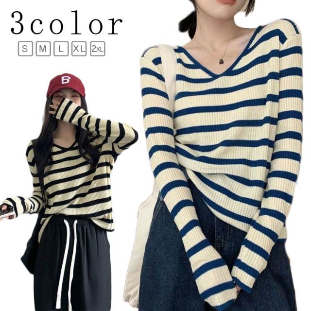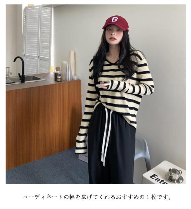 ルーズ セーター トップス ニット 秋冬 ボーダー柄 春 ボーダー柄 インナー ニットソー 韓国ファッション カットソー 長袖Tシャツ ニットセーター カジュアル おしゃれ シンプル プルオーバー