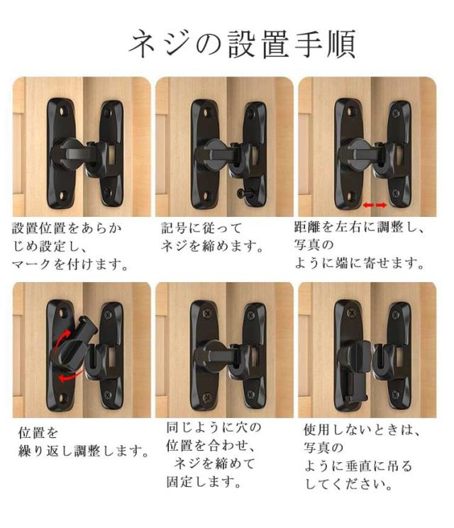 | 【高品質素材】高品質な亜鉛合金のドアバックルは、多層研磨仕上げで構成され、厚くて強化されたベース、強度が高く、腐食、錆や変色の心配はありません。簡単に壊れたり変形したりせず、耐久性に優れています。4球軸受構造を採用し、スムーズに回転でき、ワンタッチに簡単に開閉できます。 【便利でシンプル】便利なフリップデザイン、プライバシーロック、フラップは、より快適な生活環境のためにさらなるセキュリティを提供します。 【取付けも簡単】取り付け用のネジが付属しているため、留め具をすぐに設置する事ができます。左または右にインストールすることを選択できます。特殊タイプで90度の角度で取り付けられるため、ドアや窓の安全を確保するために使用できます。 【安全保護】子供ケガ防止だけでなく、部屋の外に出ていかないようにしたり、様々な危険を防止できます。簡単施錠でスライドドアの防犯対策ができます。猫の脱走防止用としてもお使いいただけます。 ※接着剤と固定シール付いておりません。 ネジの設置手順 設置位置をあらかじめ設定し、 マークを付けます。 記号に従ってネジを締めます。 距離を左右に調整し、 写真のように端に寄せます。 位置を繰り返し調整します。 同じように穴の位置を合わせ、 ネジを締めて固定します。 使用しないときは、写真のように垂直に吊るしてください。 釘なし接着剤の設置手順: 設置位置をあらかじめ設定し、 マークを付けます。 台座に釘なし接着剤を塗ります。 留め具をしぼって接着し、 脱落防止の補助シールを 貼ります。 位置を繰り返し調整します。 同様に接着剤を塗ります。 (ネジは塗布しない) 補助シールを貼った後、 72時間静置します。 (冬はもっと長い) | |
