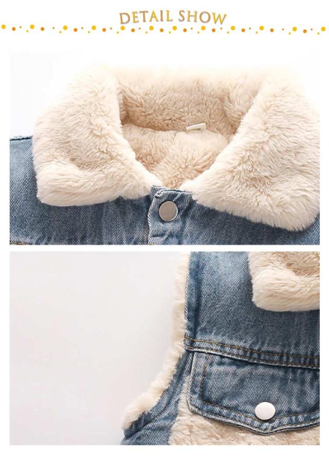 120 韓国 デニムベスト 冬 ふわふわ もこもこ 裏起毛 フェイクファー 襟付き 秋 厚手 トップス 防寒 デニム かわいい アウター スナップボタン キッズ 子供服 女の子 羽織り おしゃれ 極厚 暖かい ベスト 保温 90 100 110 ファーベスト 130
