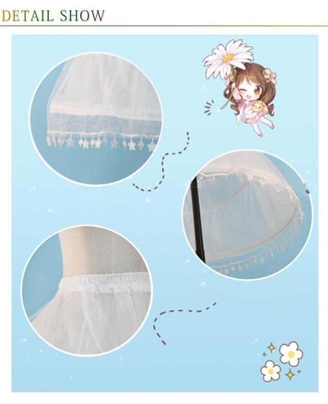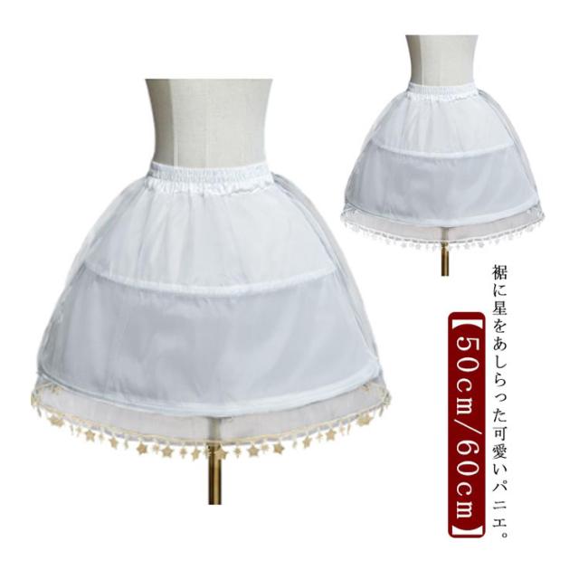 | 裾に星をあしらった可愛いパニエ。【50cm/60cm】 ソフトなチュール生地を使用しているので、チクチクしないのがポイントです。 ウエストゴム仕様でストレスフリーなはき心地。 ウェディングドレス、Lolita洋服、メイド服、ダンスドレスなどにボリュームが欲しい方におすすめのアイテムです。 | |