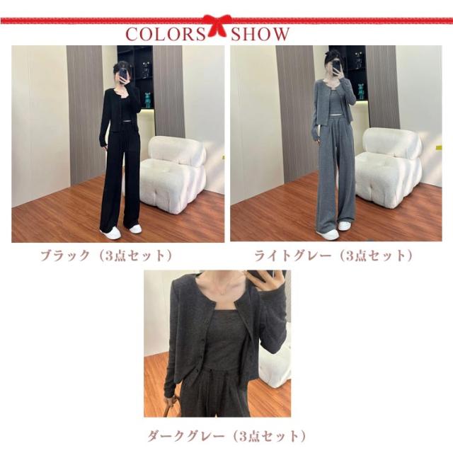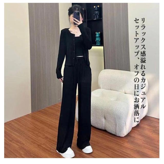 3点セット キャミソール+カーディガン+ワイドパンツ 秋服 レディース 上下セット 羽織り 上着 スウェット セットアップ ショート丈 カーデ 薄手 ルームウェア 部屋着 オフィスカジュアル 通勤 カジュアル セットアップ