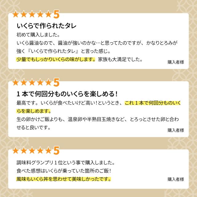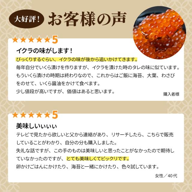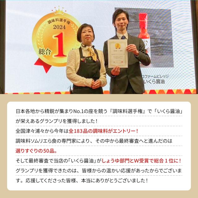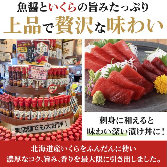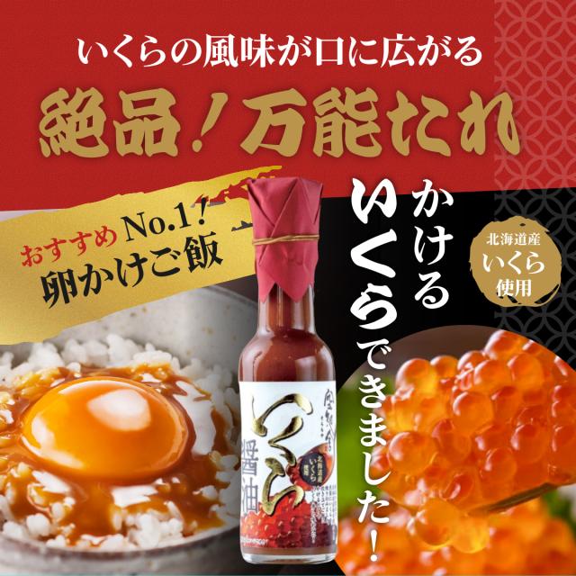 | ☆2025年7月10日にTBSテレビ系列「櫻井・有吉THE夜会」で紹介されました! ☆2024年12月4日に日本テレビ系列「ZIP」で紹介されました! ☆2024年11月27日に日本テレビ系列「ヒルナンデス!」で紹介されました! ☆2024年10月29日にTBS系列「ひるおび」で紹介されました! ☆2024年10月29日に日本テレビ系列「DayDay」で紹介されました! ☆2024年5月1日に日本テレビ系列「ヒルナンデス!」で紹介されました! ☆2024年4月17日に日本テレビ系列「ヒルナンデス!」で紹介されました! ○2024年「第15回調味料選手権」総合1位獲得! ○北海道産いくら使用独自の製法で北海道産鮭を使用した魚醤にいくらを練り込みました。 ○炊き立てご飯にかけるだけで“いくら丼”の味わいに。 |