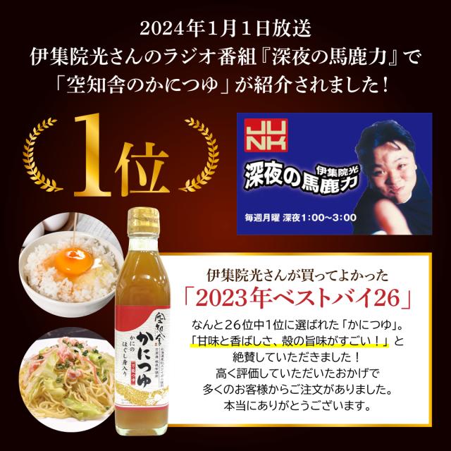 | ○「空知舎のかにつゆ」がメディアで紹介されました!2024年1月1日放送、伊集院光さんのラジオ番組『深夜の馬鹿力』で「空知舎のかにつゆ」が紹介されました! ○本品はゆでたてのカニをそのままとじこめたような香り高い“万能つゆ”です。 ○カニのフレークを入れ、隠し味で昆布、海老のエキスを配合した蟹の風味豊かな、旨味の強いつゆの素に仕上げました。 ○お吸い物、鍋つゆはもちろん、出汁巻き卵、炒飯、炊き込みご飯と幅広くご使用いただけます。 |