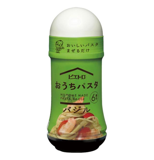 原材料 食用植物油脂(国内製造)、食塩、バジルペースト、昆布茶、風味調味料、松の実、バジルソース、砂糖、フライドガーリック、バジル、パセリ/酒精、調味料(アミノ酸等)、着色料(紅花黄、クチナシ)、増粘剤(キサンタンガム)、香辛料抽出物、(一部に乳成分・大豆・豚肉を含む)