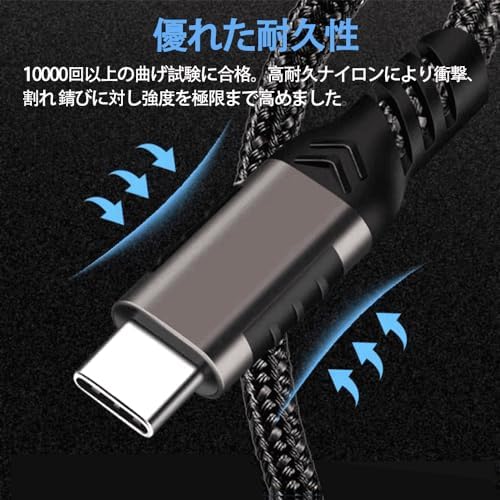 【優れたの高耐久性】高耐久ナイロン編み層のType-c ケーブルは、10000回以上の厳しい折り曲げテストにクリアしており、コネクタ部分にもアルミニウム合金製で繰り返しの抜き挿しても耐えられて使いやすい。