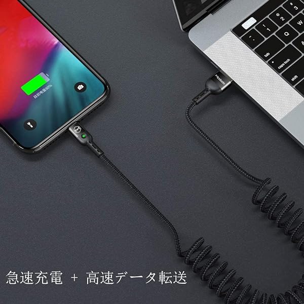 USB タイプC ケーブル カール LEDライト付き 急速充電 QC 4.0 USB TypeC to USBA 2.0 高速データ転送 コイル状 高耐久 断線防止 ナイロン編み 格納式ポータブル柔軟 USB C コード Type-C機器対応 (1.8m Type-C,ブラック)