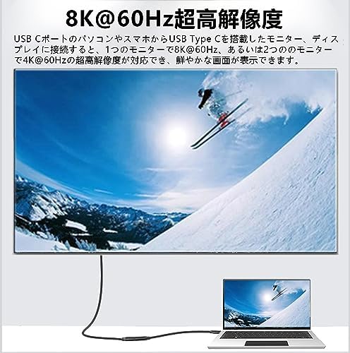 【8K@60Hz超高解像度】最も主流なビデオ解像度に対応しています。USB Type-Cポートが搭載されたパソコンやスマートフォンから、USB Type-C対応のモニターやディスプレイに接続すると、8K(7680×4320)@60Hzの高解像度1台、または4K(3840×2160)@60Hzの高解像度2台に対応して、鮮やかな画面を表示できます。