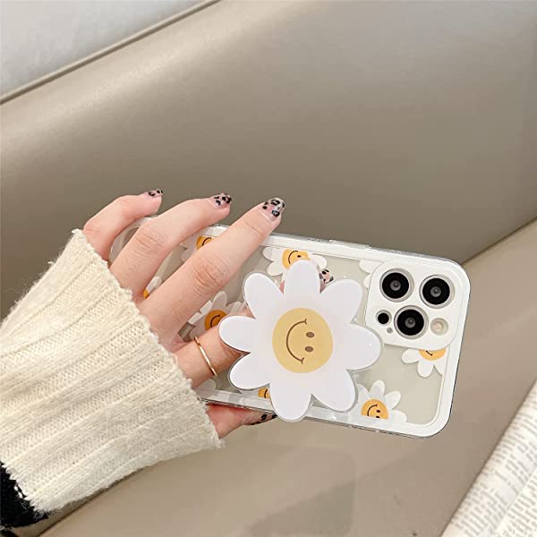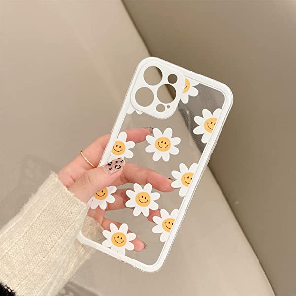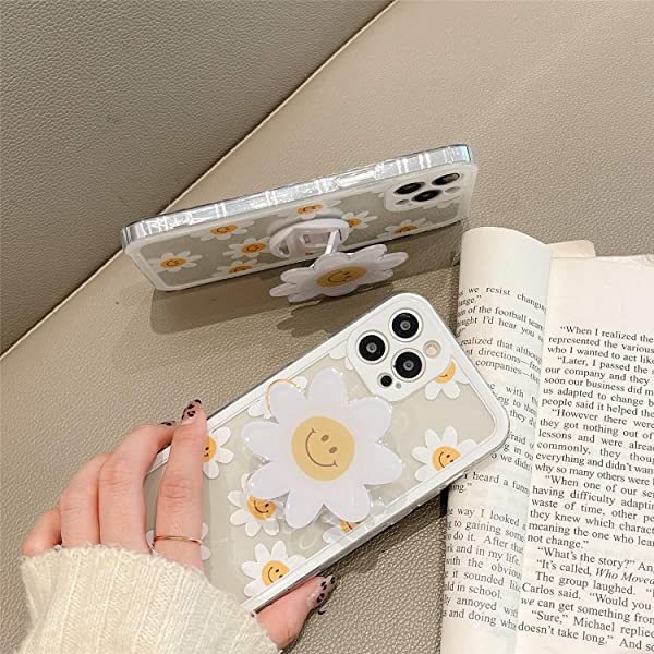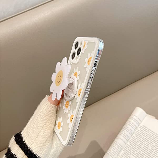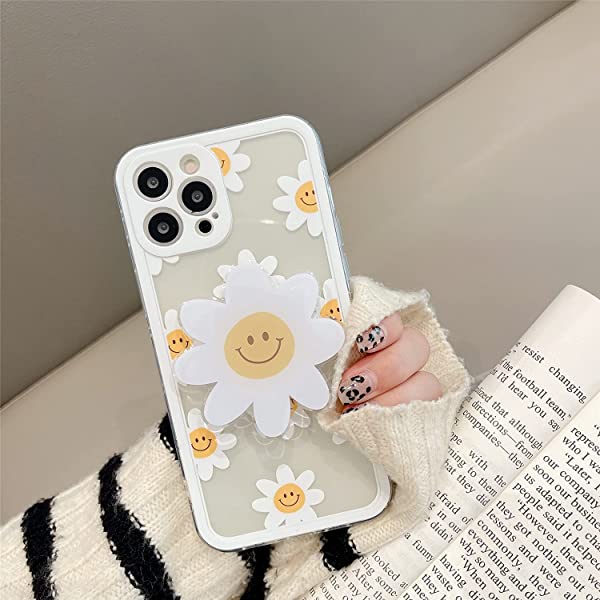 iPhone 12 Pro Max クリア ケース オシャレ 可愛い 綺麗 白い デイジー 花 絵柄 花 デザイン スタンド 付き 超薄 軽量 透明 一体型 ソフト TPU シリコーン ケース カバー カメラ レンズ 保護 耐衝撃 バンパー 送料無料