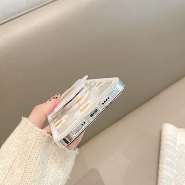 iPhone 12 Pro Max クリア ケース オシャレ 可愛い 綺麗 白い デイジー 花 絵柄 花 デザイン スタンド 付き 超薄 軽量 透明 一体型 ソフト TPU シリコーン ケース カバー カメラ レンズ 保護 耐衝撃 バンパー