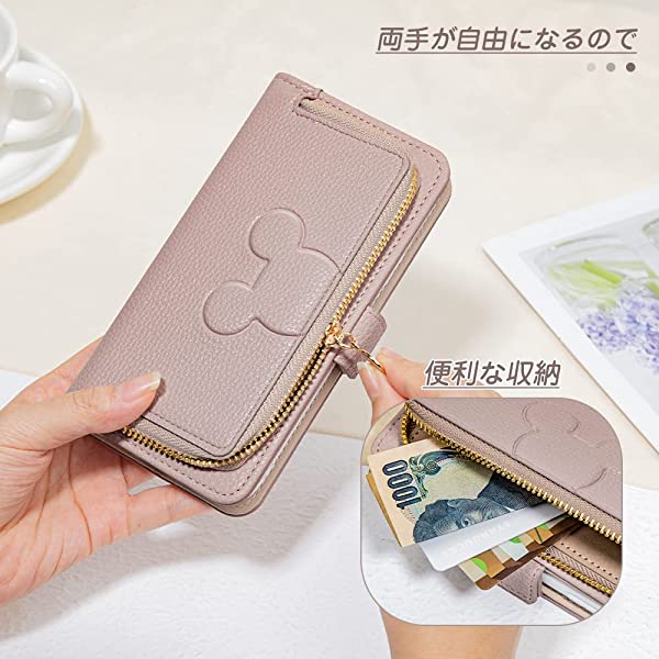 【多機能なデザイン】ショルダーストラップケースの裏にカード入れ二つと表にファスナー付きポケット1つ付きます。お札や名刺、運転免許など収納可能。スタンド機能は長時間の動画視聴にもハンズフリーで楽しめます!
