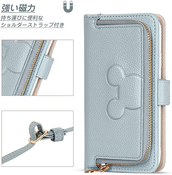 iPhone 14 (6.1) ケース 手帳型 ショルダー ストラップ 小銭入れ 動物 肩掛けケース 斜めがけ 女性向け かわいい おしゃれ 財布型 首かけ 耐衝撃性 コインケース カード収納 女性 上品 マグネット式 スマホケース 手帳 落下防止 TPU スタンド機能 ブルー