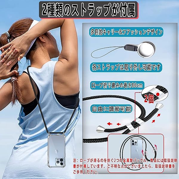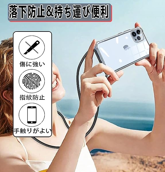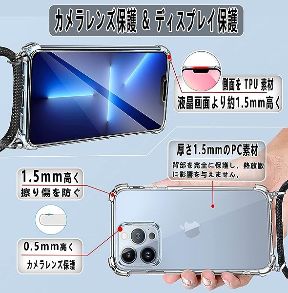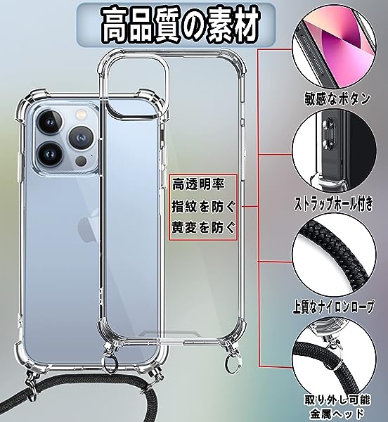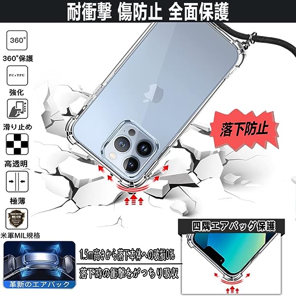 iPhone13プロ ケース iPhone 13 Pro ケース ストラップ2種付き 調節可能 ショルダー 肩がけ 首掛け 紐付き 薄型 透明 PC + 軽量 シリコン TPUバンパー カバー ストラップホール付き 耐衝撃 傷防止 全面保護 米軍MIL規格 防指紋 MagSafe ワイヤレス充電 ...