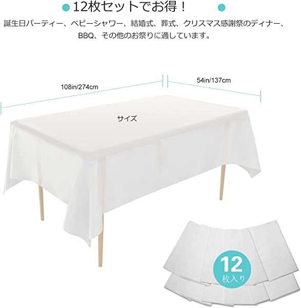 【12枚入り】 使い捨てテーブルクロス プラスチック 137 x 274cm プレミアム長方形テーブルカバー -ホワイト