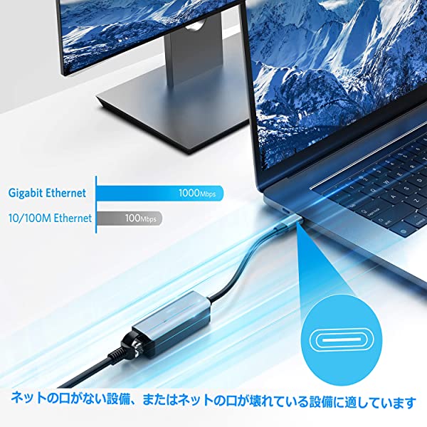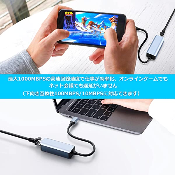 【USB/TYPE-Cイーサネットアダプタ】パソコンやデスクトップパソコンのUSBポートまたはtype-cポートを1つ、有線LAN回線での接続に対応しました。有線LANポートは、最大1000MBPSの高速回線速度で仕事が効率化、オンラインゲームでもネット会議でも遅延がない(下向き互換性100MBPSに対応)