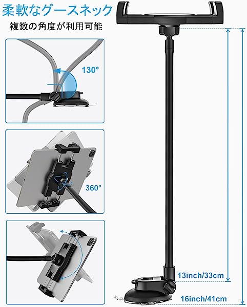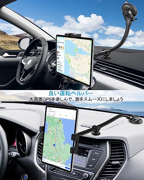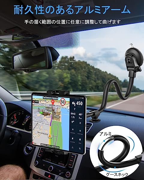 タブレットホルダー ipad車載ホルダー 33cm長いアーム 超強力吸盤 車載用タブレットスタンド フロントガラス タブレットアーム 柔軟に曲げ 360度回転 片手脱着 取り付け簡単 タブレットとスマートフォン4.7〜13インチ全機種対応 iPad Pro 9.7 11 12.9 インチ/iPad Air/iPad Mini/iPhone 13 12 11/日本語説明書付き