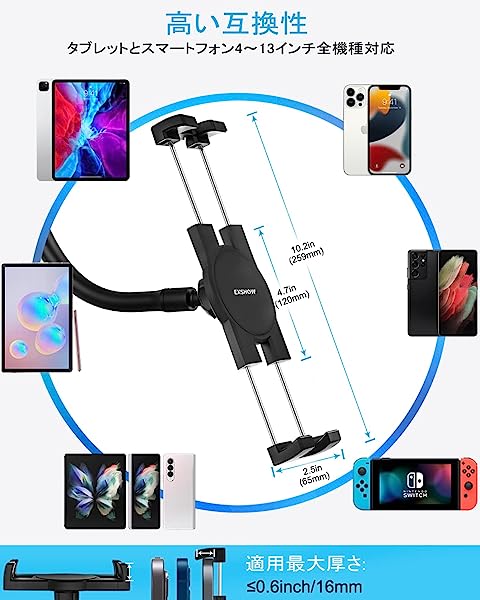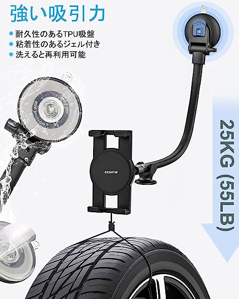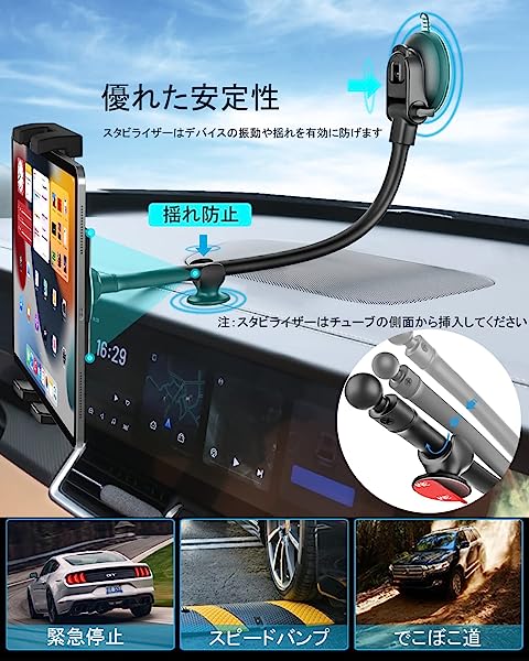 【多機能ロングアームカーホルダー】タブレットやスマートフォン用に設計されたカーホルダー。工具を使わずに、吸盤をフロントガラスやダッシュボードに簡単に取り付けることができます。33cmの非常に長い、非常に柔軟なアームにより、手の届く範囲でデバイスを簡単に調整し、タブレット画面に簡単にアクセスできます。小型車だけでなく大型トラックにも適した強力な互換性。ナ
