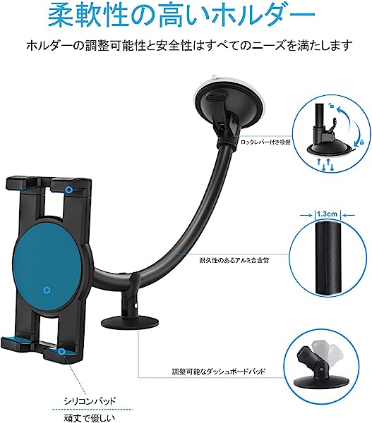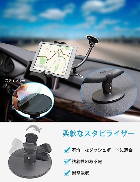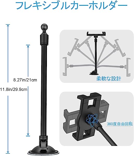 車載ホルダー タブレットホルダー フロントガラス 強力真空吸盤式タブレットスタンド タブレットアーム サクションカップマウントスマホスタンド 柔軟に曲げipad車載ホルダー 車ガラスとダッシュボードに適用 360度回転 日本語説明書付き タブレットとスマートフォン4〜13インチ全機種対応 iPad Pro 9.7 11 12.9 インチ/iPad Air Mini/iPhone