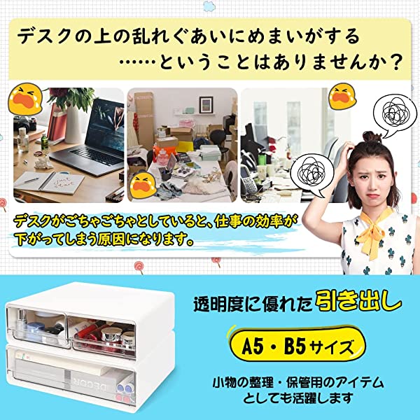 【一目瞭然な引き出し】引き出しごとに透明なデザインを採用しており、収納しているものが一目瞭然です。透明度の高いので、物を探す手間がかかりません。卓上収納ボックスで使いやすく、見た目もきれいに片付きます