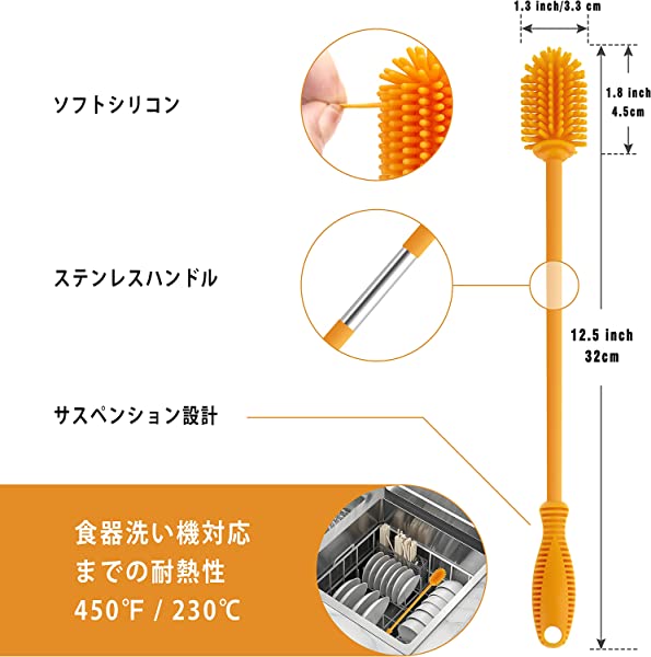 【高品質素材】すべてのブラシはFDA認定のシリコン素材と100%BPAなし、食品級のシリコンボトルブラシ、汚染がなく、絶対な環境保護が施されています。