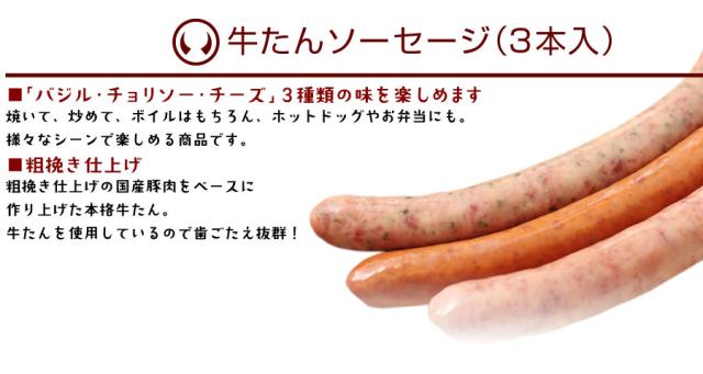 【牛たんソーセージ(3種)】牛タン、豚肉、乳たん白、糖類(水あめ、砂糖)、チーズ、食塩、香辛料、バジル/リン酸塩(Na)、調味料(アミノ酸)、保存料(ソルビン酸)、酸化防止剤(V.C)、発色剤(亜硝酸Na)、(原材料の一部に乳成分を含む)