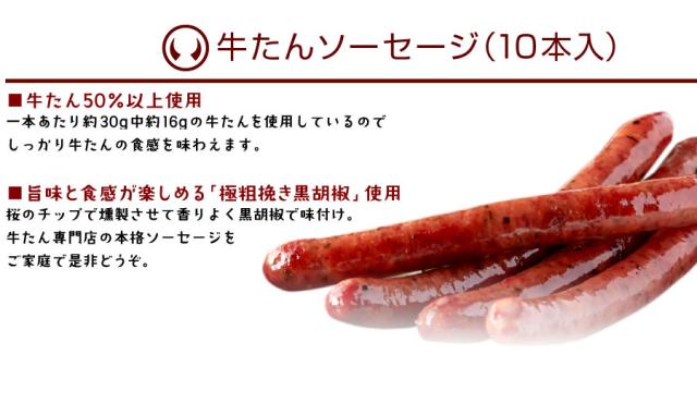 【牛たんソーセージ(10本入り)】牛タン、豚肉、乳清たん白、水あめ、食塩、香辛料、砂糖/リン酸塩(Na)、調味料(アミノ酸)、保存料(ソルビン酸K)、酸化防止剤(V.C)、発色剤(亜硝酸Na)、(原材料の一部に乳成分を含む)