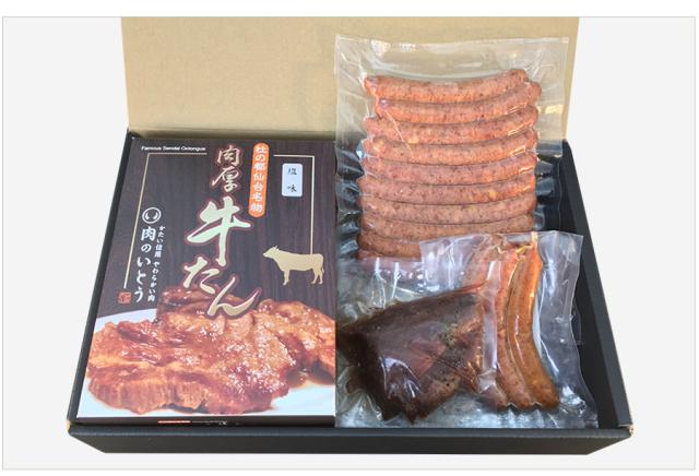 ○内容量:肉厚牛たん塩味(300g)×1、肉厚牛たん味噌味(300g)×1、牛たん入りソーセージ(黒胡椒入り・10本入り)300g、牛たんソーセージ(バジル・チョリソー・チーズの3種)90g、ロースト牛たん(130〜150g)