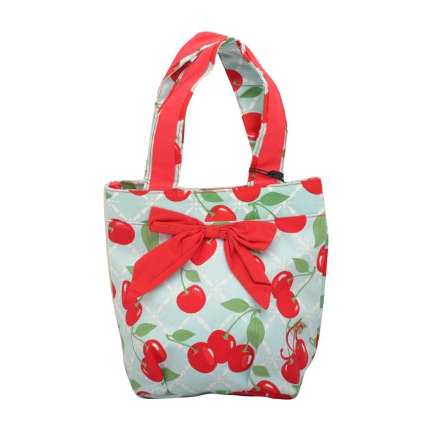 商品名:ジェシースティール Jessie Steele バッグ リボン付 ランチバッグ トートバッグ ミニバッグ 811-js-15 KITCHEN CHERRY キッチンチェリー ライトブルー+レッド+さくらんぼ柄