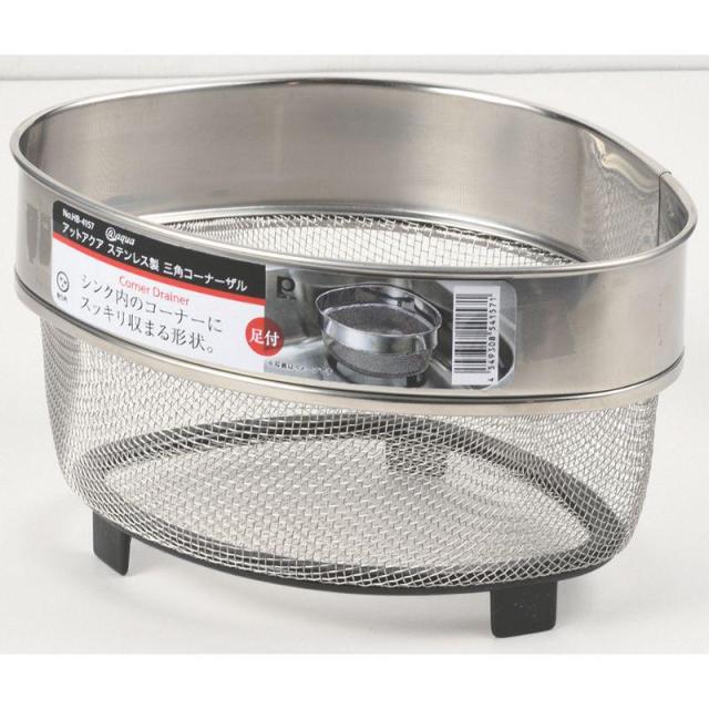 ステンレス製の三角コーナーザルです。この製品は、シンクの隅に設置することで、食材の水切りやゴミの収集に便利なアイテムです。