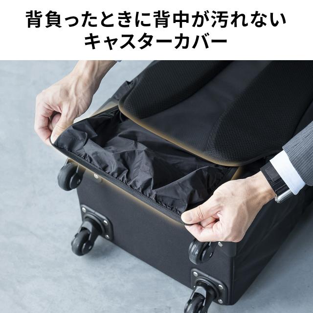 ●リュック使用時は、キャスターカバー付きでなので背中が汚れず、ショルダーベルトはクッション入りでベルト長も調整が可能です。